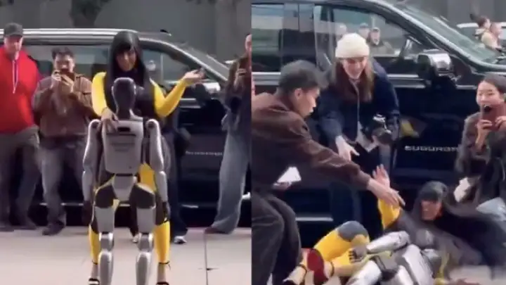Integrantes da equipe foram ajudá-la a se levantar, e ela pediu desculpas aos funcionários; em seguida, o robô foi reposicionado.