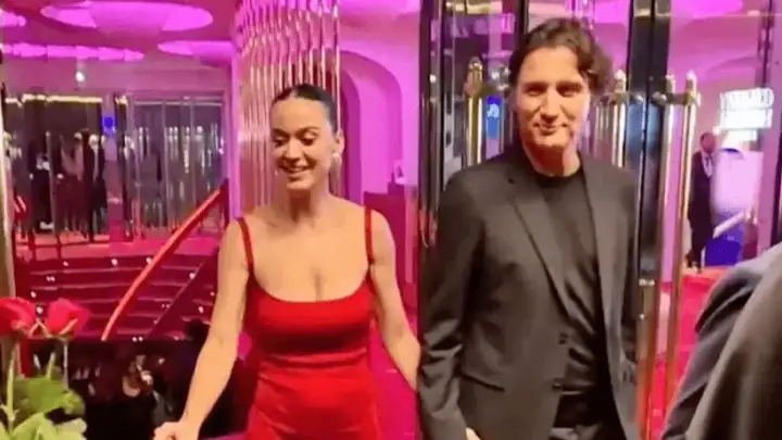 Nas imagens veiculadas, Katy aparece deslumbrante com um longo vestido vermelho, enquanto Trudeau optou por um elegante terno preto.